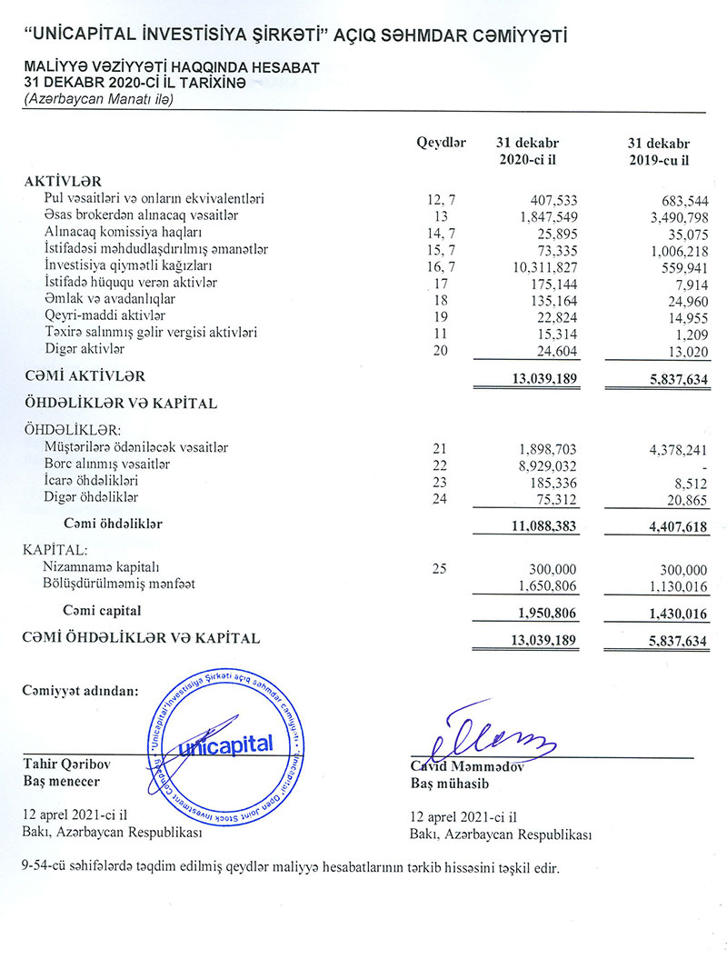 2020-ci ilin sonuna "Unicapital"ın aktivləri 13 milyon 39 min manat olub ki, bu da 2019-cu il illə müqayisədə 2,2 dəfə artım deməkdir.