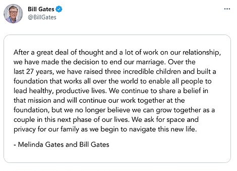 “Böyük düşüncə birliyi və münasibətlərimiz əsasında gördüyümüz çoxlu işlərdən sonra, biz evliliyimizə son vermək qərarına gəlmişik. 27 il ərzində biz üç mükəmməl övlad böyütmüşük və bütün insanlara sağlam və məhsuldar həyat sürməyə imkan yaratmaq üçün dünya miqyasında işləyən bir fond qurmuşuq. Biz həmin missiyaya inamımızı paylaşırıq və birgə işimizi davam etdirəcəyik, lakin ömrümüzün bundan sonrakı mərhələsində həyat yoldaşı kimi birlikdə addımlaya biləcəyimizə inanmırıq. Yeni həyatda öz istiqamətimizi tapmağa başladığımıza görə, ailəmiz üçün yer və məxfilik istəyirik”.