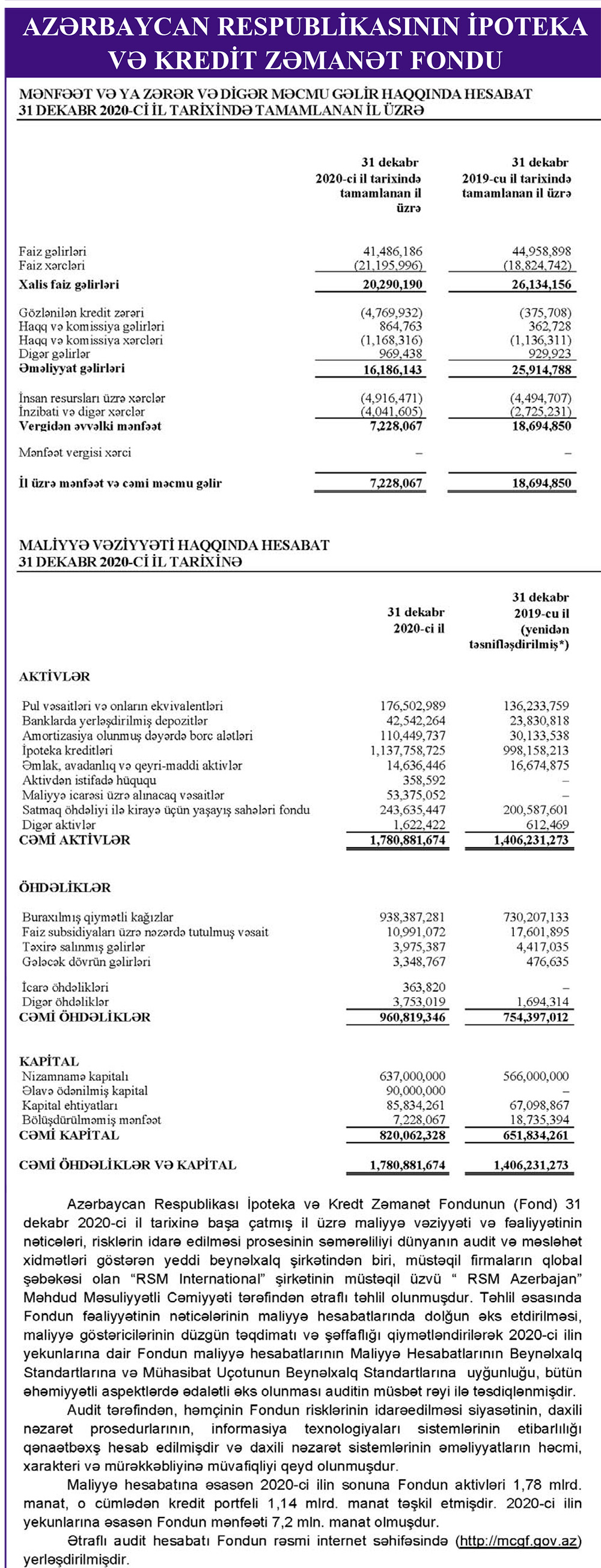 Azərbaycan İpoteka və Kredit Zəmanət Fondu 2020-ci ili 7 milyon 228 min manat xalis mənfəət ilə başa vurub. Fond 2019-cu ili 18 milyon 695 min manat xalis mənfəət ilə bağlamışdı. Beləliklə, ötən il Fondun xalis mənfəəti 2,6 dəfə azalıb.