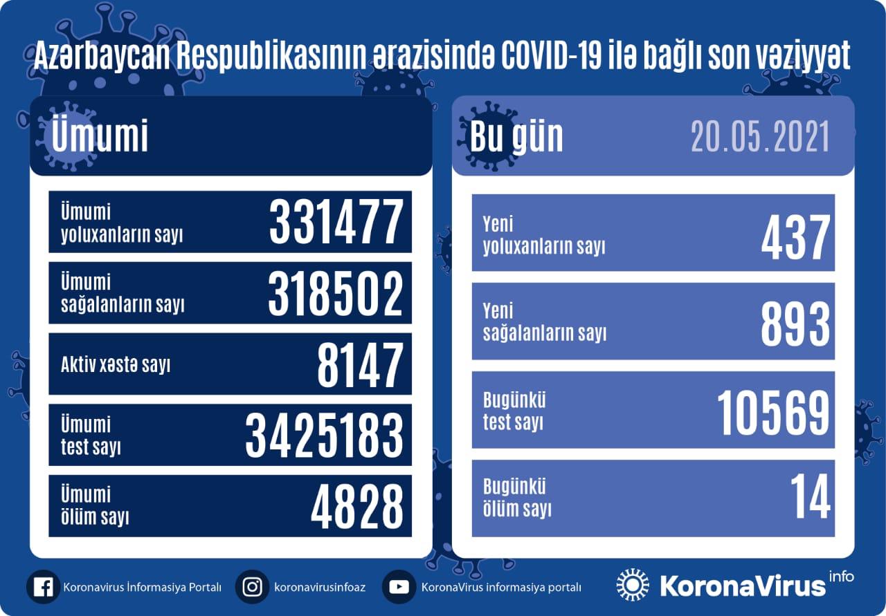 Azərbaycanda bu gün koronavirus infeksiyasına 437 yeni yoluxma faktı qeydə alınıb, 893 nəfər müalicə olunaraq sağalıb və evə buraxılıb.