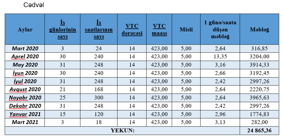 Belə ki, K.Namazovaya 2020-ci ilin mart ayından 2021-ci ilin mart ayı da daxil olmaqla iş vaxtına/saatına mütənasib olaraq ümumilikdə 24 min 865 manat 36 qəpik müddətli əlavə ödənilib.
