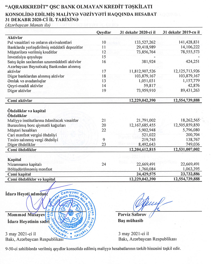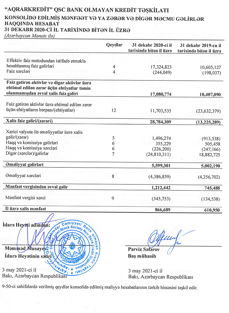 “Aqrarkredit” QSC bank olmayan kredit təşkilatı (BOKT) 2020-ci ili 867 min manat xalis mənfəətlə başa vurub.