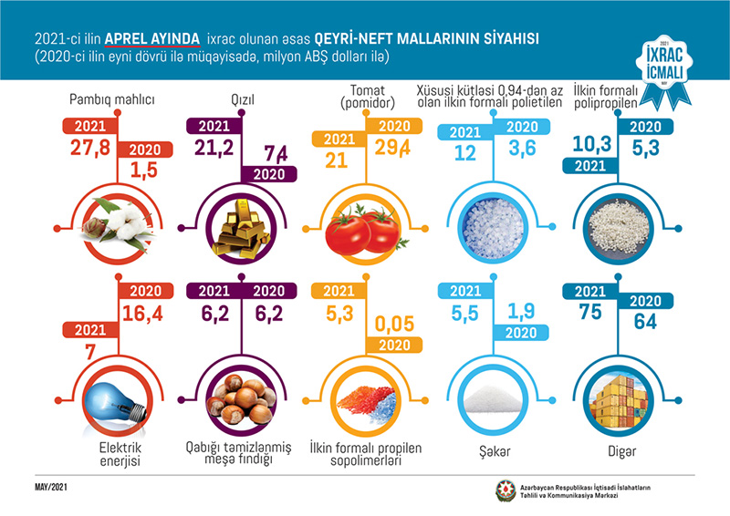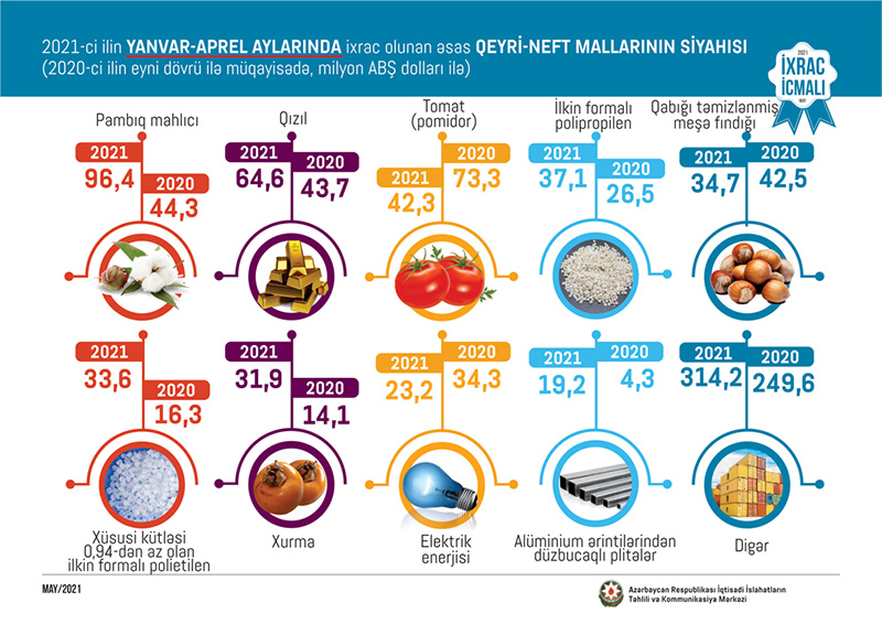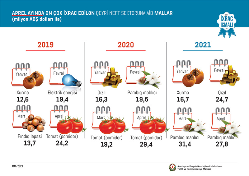 2021-ci ilin aprel ayında ixrac edilən qeyri-neft sektoruna aid malların siyahısında pambıq mahlıcı (27,8 milyon ABŞ dolları) birinci, qızıl (21,2 milyon ABŞ dolları) ikinci və pomidor (21 milyon ABŞ dolları) üçüncü olub.