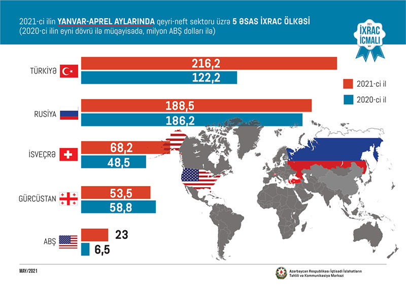 2021-ci ilin yanvar-aprel ayları ərzində Türkiyəyə 216,2 milyon, Rusiyaya 188,5 milyon, İsveçrəyə 68,2 milyon, Gürcüstana 53,5 milyon və ABŞ 23 milyon ABŞ dolları dəyərində qeyri-neft sektoruna aid mal ixrac olunub.
