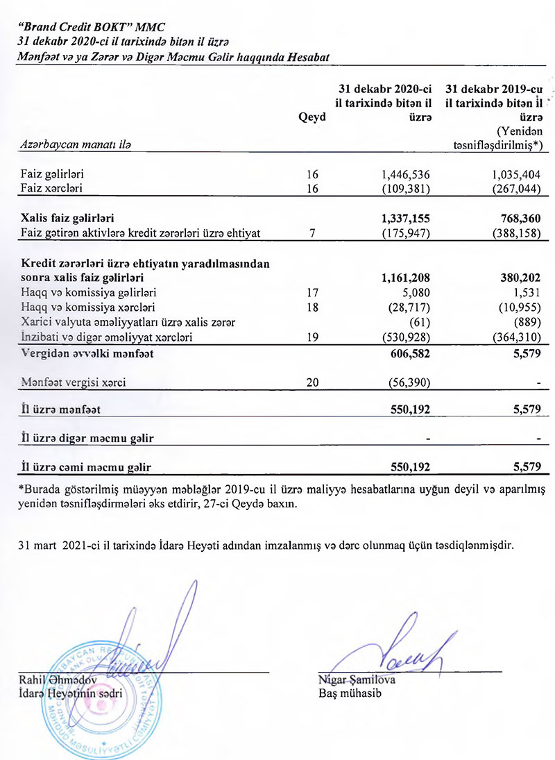 “Brand Credit” MMC bank olmayan kredit təşkilatı (BOKT) 2020-ci ili 550 min manat xalis mənfəətlə başa vurub. Halbuki, BOKT 2019-cu ildən 6 min manat mənfəətlə çıxmışdı.