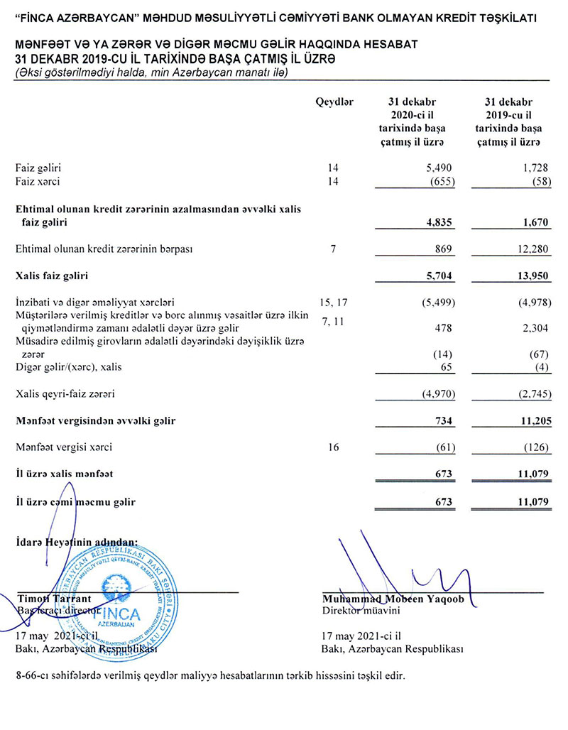 Hesabatdan məlum olur ki, “FİNCA Azərbaycan”ın cari fəaliyyətində tənəzzül mövcud deyil, xalis mənfəətin azalması ehtiyatdan azad olan vəsaitin azalması ilə əlaqədardır. Təşkilat əvvəlki dövrlərdə ehtimal olunan kredit zərərlərinin bərpası üçün ehtiyat yaratmışdır. Verilmiş kreditlər üzrə gözlənilən qədər zərər olmadığından 2019-cu ildə ehtiyatın bir hissəsi gəlirə əlavə edilmişdi. Bu səbəbdən “FİNCA Azərbaycan”ın xalis mənfəəti yüksək olmuşdu.