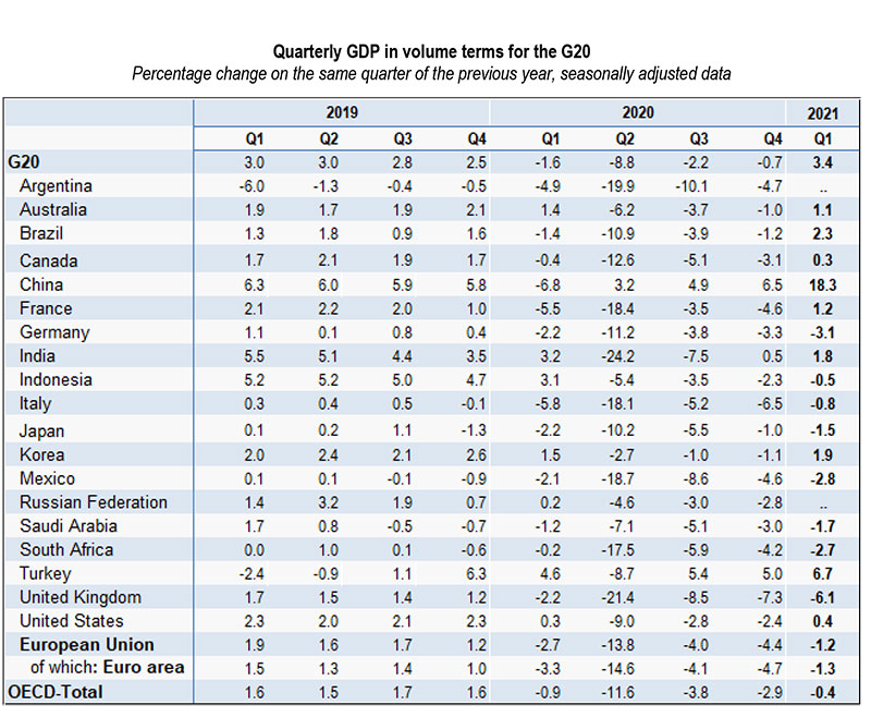 Hindistan, Türkiyə və Çin ÜDM səviyyələrini pandemiyadan əvvəlki dövrə qaytara bilən ilk ölkələr sırasındadır. Artıq 2021-ci ilin birinci rübündə bu nəticəni əldə edən üçlükdə ÜDM artımı müvafiq olaraq 2,1%, 1,7% və 0,6% təşkil edib. Əlavə olaraq, Avstraliya (1,8%), Cənubi Koreya (1,7%) və Braziliya (1,2%) da birinci rübdə pandemiyadan əvvəlki inkişaf səviyyəsinə qayıdıblar.