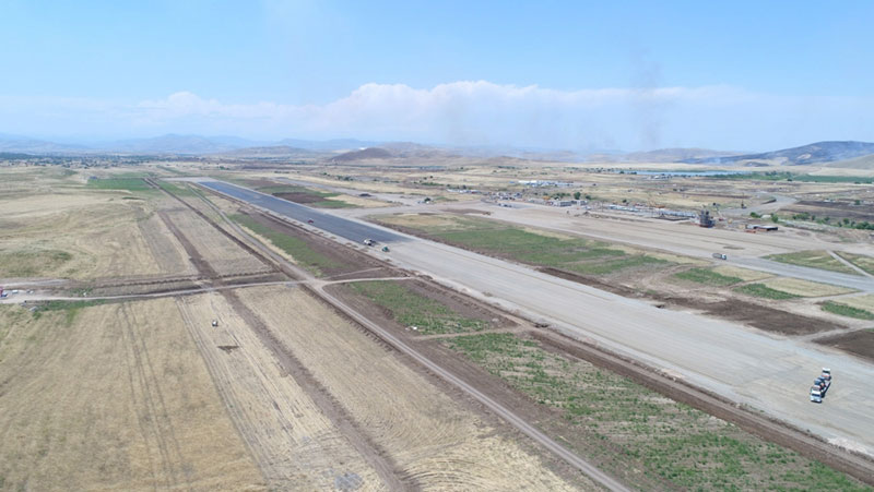 “AzVirt” MMC-nin baş direktoru Kamil Əliyev: Cənab Prezident, Füzuli Beynəlxalq Hava Limanının tikintisinə yanvar ayında başlanmışdır. Bu plakatda 3 min metr uzunluğunda, 60 metr enində uçuş-enmə zolağı əks olunub. Təyyarələrin enişi iki tərəfdən də təmin olunur. Bu günə biz uçuş-enmə zolağının və perronun tikintisində torpaq işlərini bitirmişik. İndi biz yol geyiminin tikintisi ilə məşğuluq.