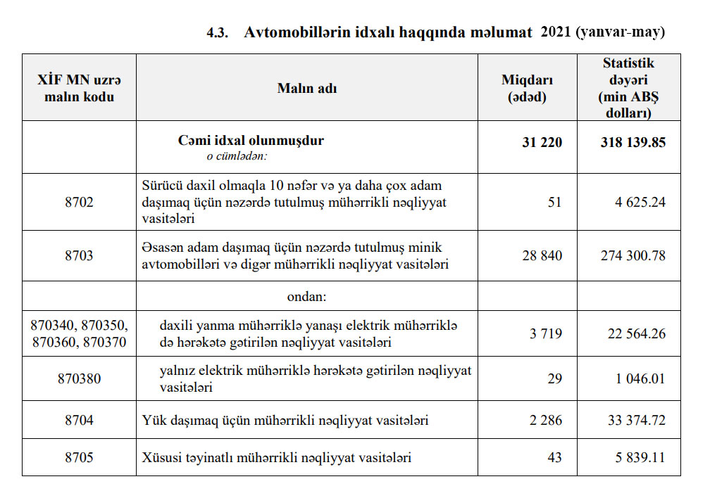 2021-ci ilin yanvar-may ayları ərzində (ilk 5 ayda) Azərbaycana 318 milyon 140 min dollar dəyərində 31 min 220 ədəd avtomobil (nəqliyyat vasitələri) idxal edilib.