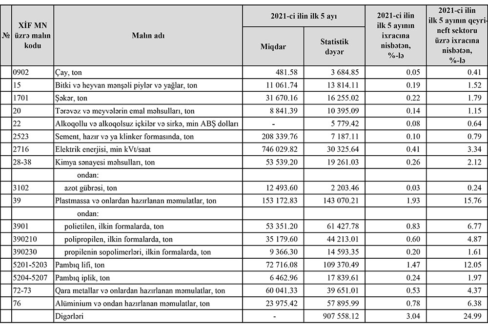 2021-ci ilin yanvar-may aylarında Azərbaycanın ən çox ixrac və idxal etdiyi mallar açıqlanıb.