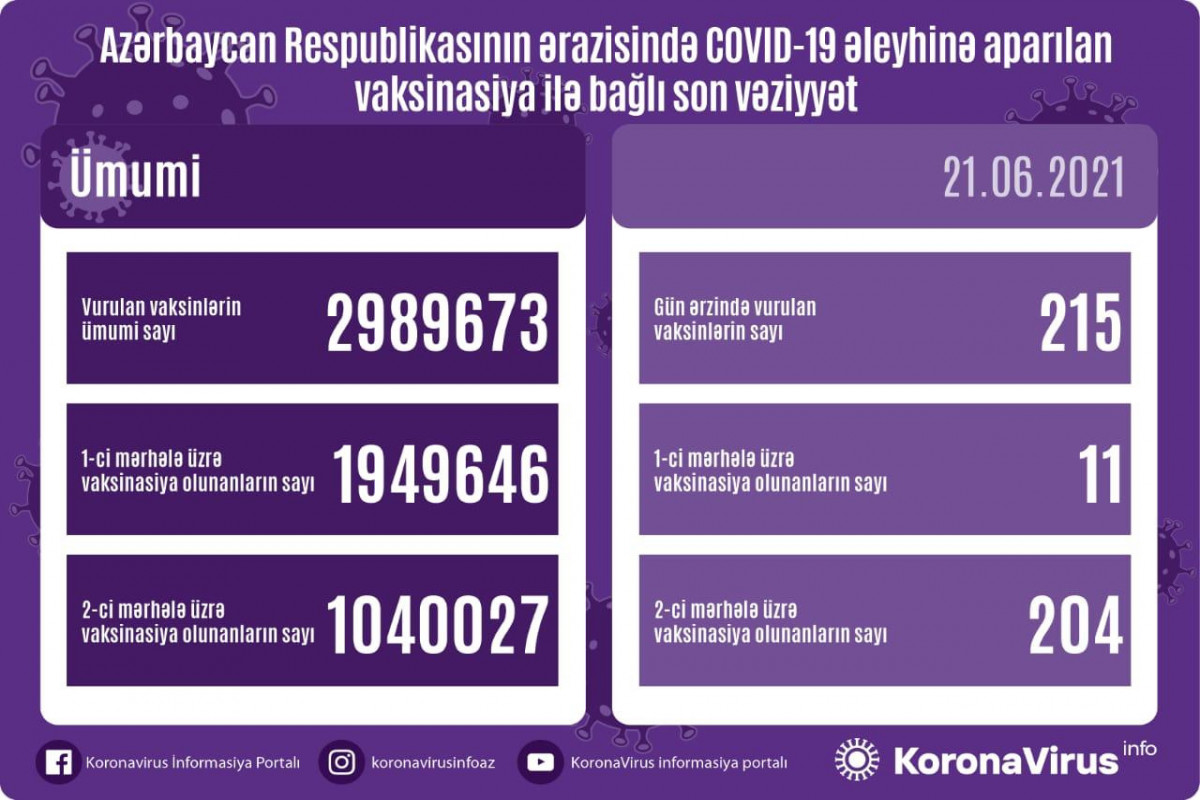 Ölkədə vurulan vaksinlərin ümumi sayı 2989673, birinci mərhələ üzrə vaksinasiya olunanların ümumi sayı 1949646, ikinci mərhələ üzrə vaksinasiya olunanların sayı isə 1040027 təşkil edir.
