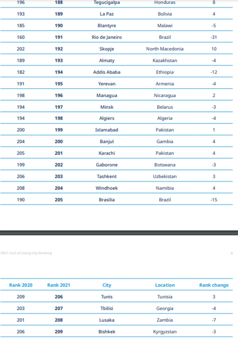 Siyahıda 2020-ci illə müqayisədə maraqlı dəyişikliklər var. Ötən il 45-ci olan Livanın paytaxtı Beyrut bu il kifayət qədər yüksələrək, 3-cü ən bahalı şəhər adını qazanıb. Səbəb ölkədəki iqtisadi tənəzzül, pandemiya və siyasi risklərdir. Avstraliya və Avropa şəhərləri də yuxarıya doğru ən çox yerini dəyişib. Nyu-York 10 ən bahalı şəhər siyahısından çıxıb, ötən il 21-ci olan Moskva bu il 62-ci, 59-cu olan Sankt-Peterburq isə mövqeyini 60 pillə itirərək, 119-cu yerə düşüb.