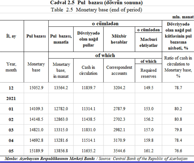 May ayında pul bazası 15 milyard 189,9 milyon manata yüksələrək rekord qırıb. Pul bazasının daha da artmasına nağd pulların və müxbir hesabların artması təsir göstərib.