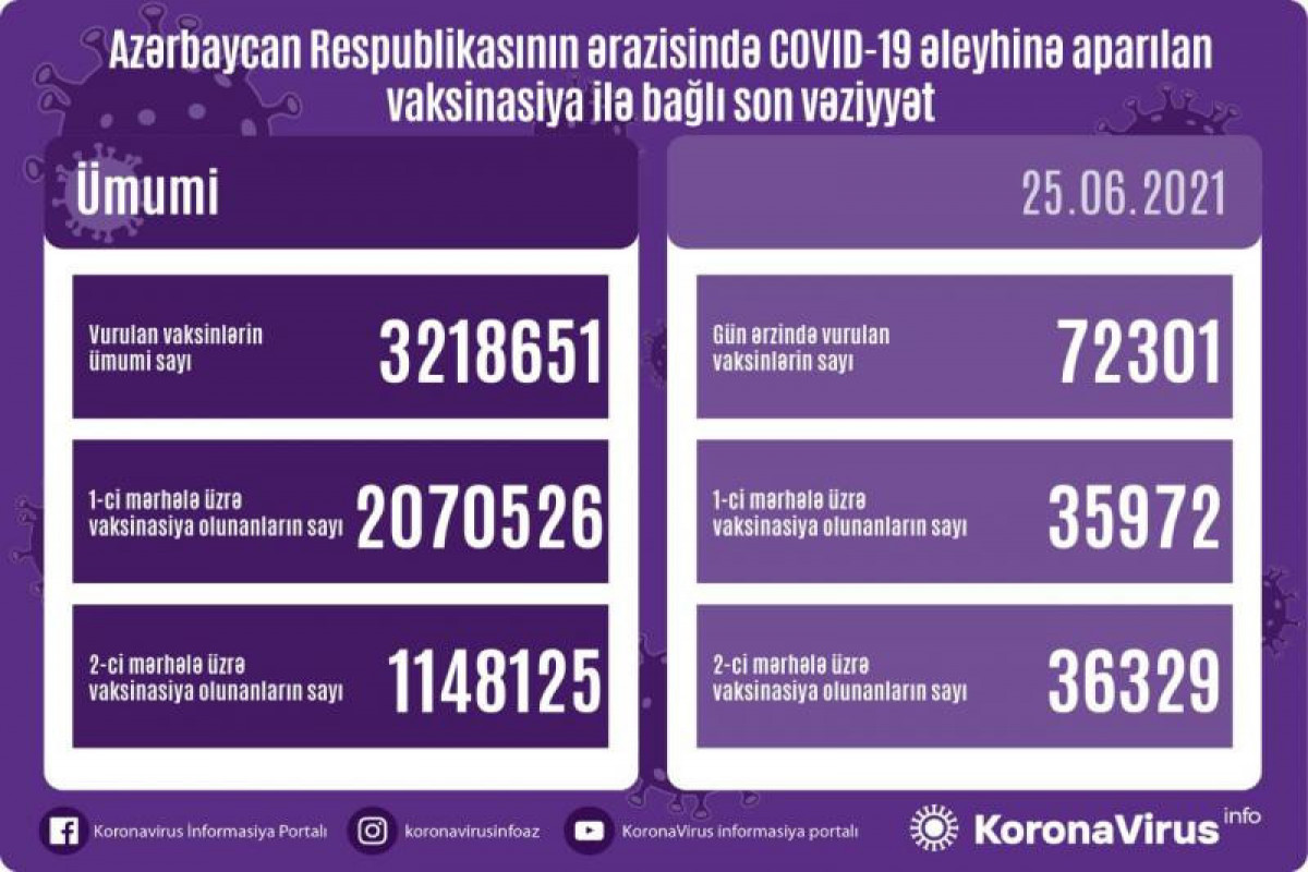 Azərbaycanda son sutkada koronavirus (COVID-19) əleyhinə 72 301 vaksin vurulub.