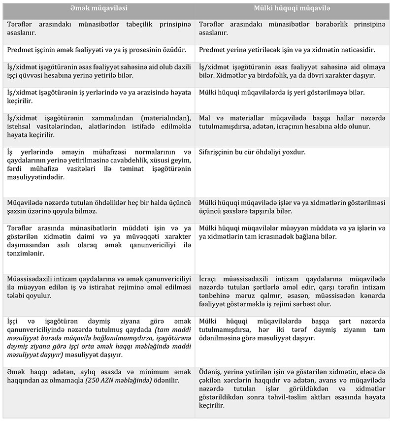 Ümumi olaraq isə əmək münasibətlərini mülki hüquqi münasibətlərdən fərqləndirən incə bir çizgi var. Aşağıda əmək müqavilələri ilə mülki hüquqi müqavilələri bir birindən fərqləndirən əsas halları ümumiləşdirməyə çalışmışıq.