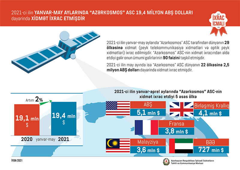 2021-ci ilin may ayında isə “Azərkosmos” ASC dünyanın 22 ölkəsinə 2,5 milyon ABŞ dolları dəyərində xidmət ixrac edib.
