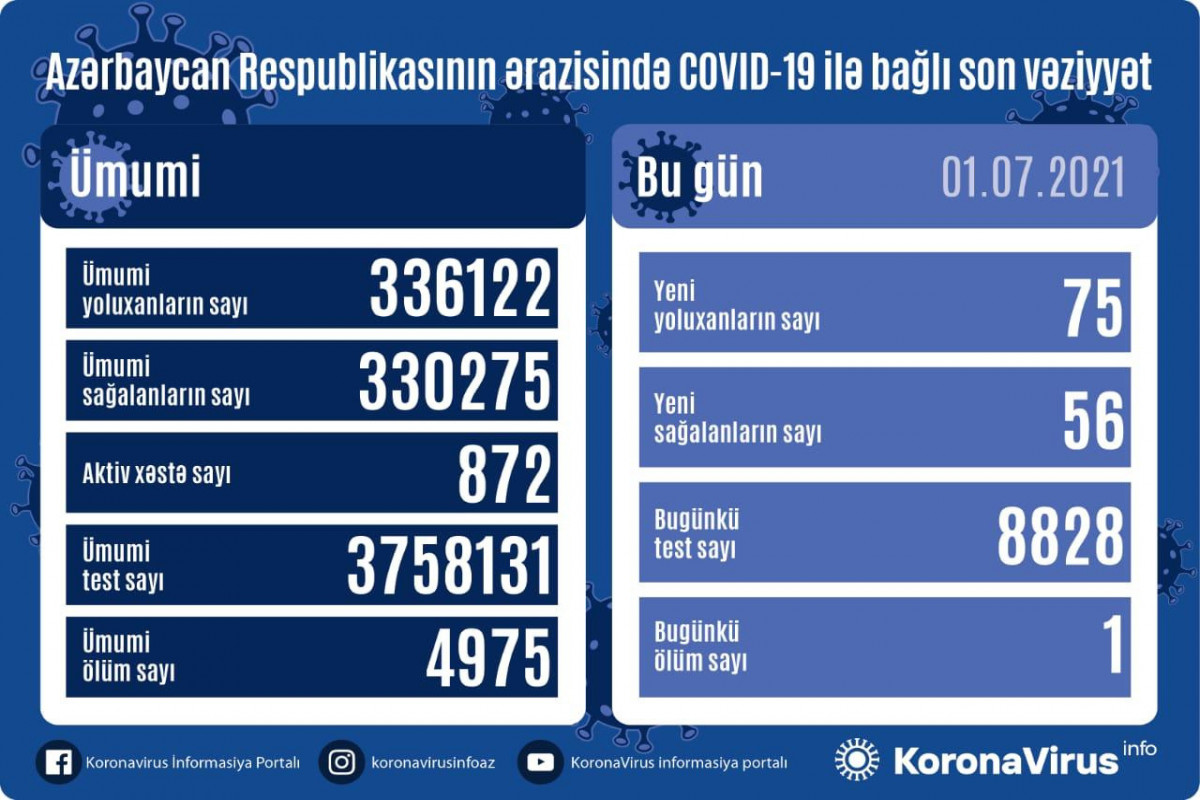 Azərbaycan Respublikasında koronavirus (COVID-19) infeksiyasına 75 yeni yoluxma faktı qeydə alınıb, 56 nəfər müalicə olunaraq sağalıb.