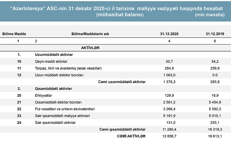 Bu il yanvarın 1-nə “Azərlotereya”nın aktivləri 12 milyon 659 min manat olub ki, bu da illik müqayisədə 23,8% azdır. Hesabat dövründə 55,35% azalaraq 3 milyon 815 min manata düşüb, balans kapitalı isə 9,6% artaraq 8 milyon 843 min manata çatıb.