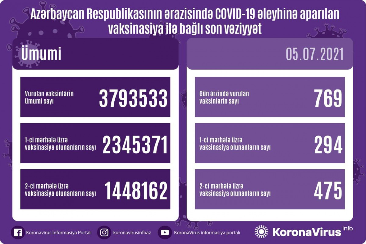 Ölkədə vurulan vaksinlərin ümumi sayı 3793533, birinci mərhələ üzrə vaksinasiya olunanların ümumi sayı 2345371, ikinci mərhələ üzrə vaksinasiya olunanların sayı isə 1448162 təşkil edir.