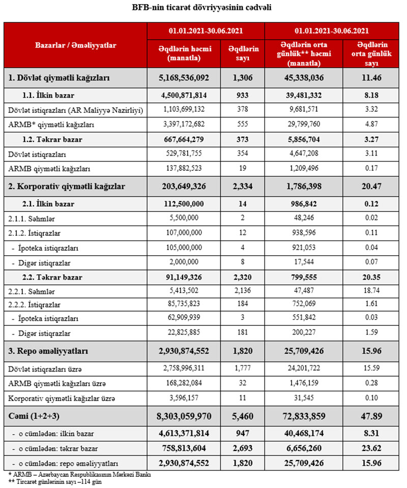 Bakı Fond Birjasında 2021-ci ilin yanvar-iyun ayları ərzində qiymətli kağızlar üzrə keçirilən əməliyyatların ümumi həcmi 8 milyard 303 milyon 60 manat təşkil edib.