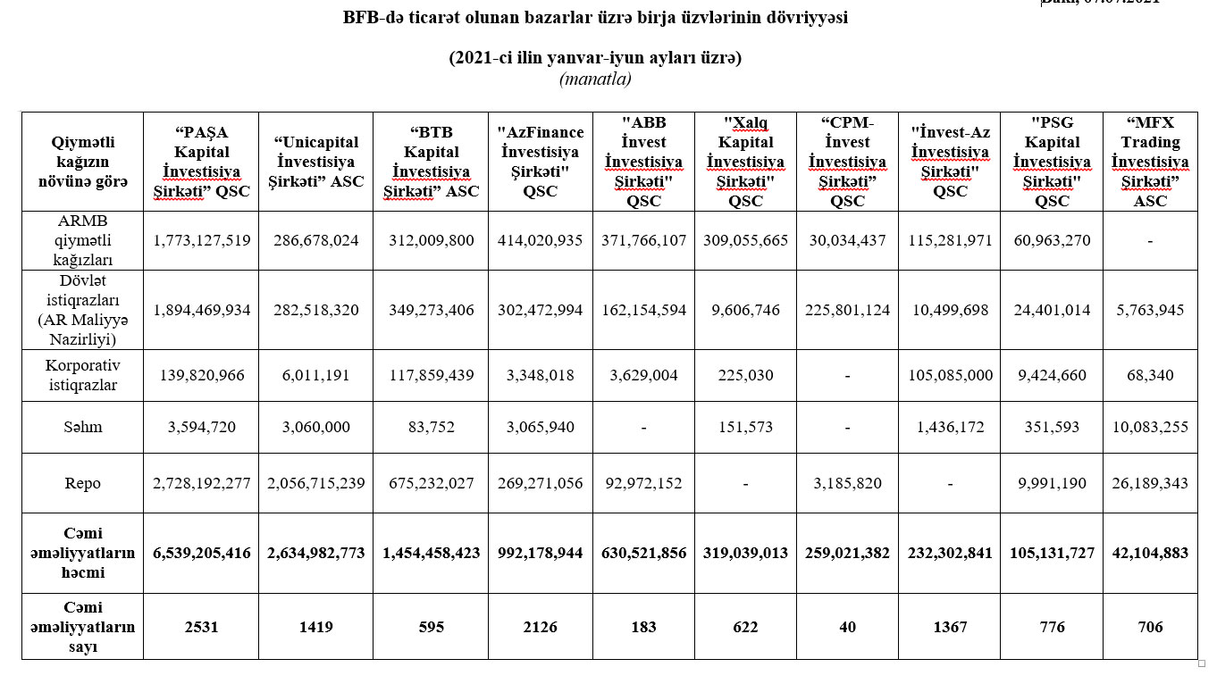 Marja Birja-ya istinadən xəbər verir ki, 2021-ci ilin yanvar-iyun ayları üzrə, cəmi dövriyyənin məbləğinə görə, “PAŞA Kapital İnvestisiya Şirkəti” QSC 1-ci, “Unicapital İnvestisiya Şirkəti” ASC 2-ci, “BTB Kapital İnvestisiya Şirkəti” ASC 3-cü yeri tutub.
