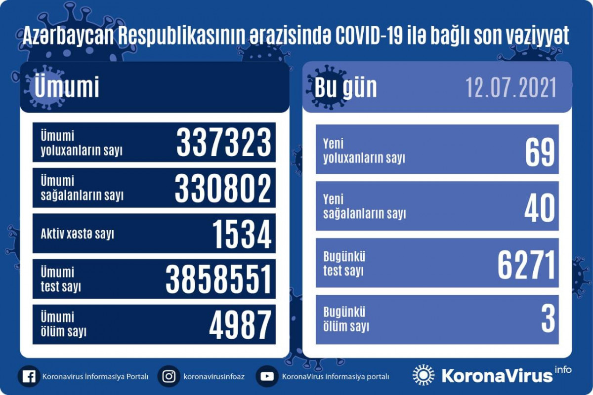 Azərbaycan Respublikasında koronavirus (COVID-19) infeksiyasına 69 yeni yoluxma faktı qeydə alınıb, 40 nəfər müalicə olunaraq sağalıb.