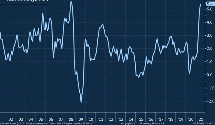 ABŞ-da inflyasiya İyun ayında proqnozların üzərində bir artımla illik 5,4% təşkil edib. ABŞ-da inflyasiya sonuncu dəfə 2008-ci ilin Avqust ayında 5,4% olaraq reallaşmışdı.