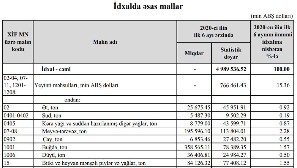 6 aylıq buğda idxalı 78 milyon 389 min dollardan 102 milyon 23 min dollara, bitki yağları idxalı isə 77 milyon 408 min dollardan 117 milyon 566 min dollara yüksəlib. Buğda və bitki yağları idxalının statistik dəyərinin artımı ilə müqayisədə miqdar ifadəsilə artım az olub. Statistik dəyərin artması dünya bazarlarında qiymətlərin qalxması ilə əlaqədardır.