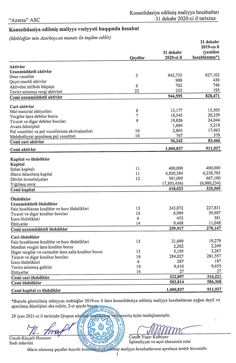 “Mühasibat uçotu haqqında” Azərbaycan Respublikası Qanununun 8.1-ci bəndinə əsasən “Azərsu” ASC-nin Maliyyə Hesabatlarının Beynəlxalq Standartlarının tələblərinə uyğun olaraq illik birləşdirilmiş (konsolidə edilmiş) maliyyə hesabatları hazırlanıb və bu hesabatlar müstəqil auditor təşkilatı tərəfindən audit edilib. 31 dekabr 2020-ci ilə Cəmiyyətin əsas vəsaitləri 115,6 milyon manat artaraq 942,7 milyonmanat təşkil edib.