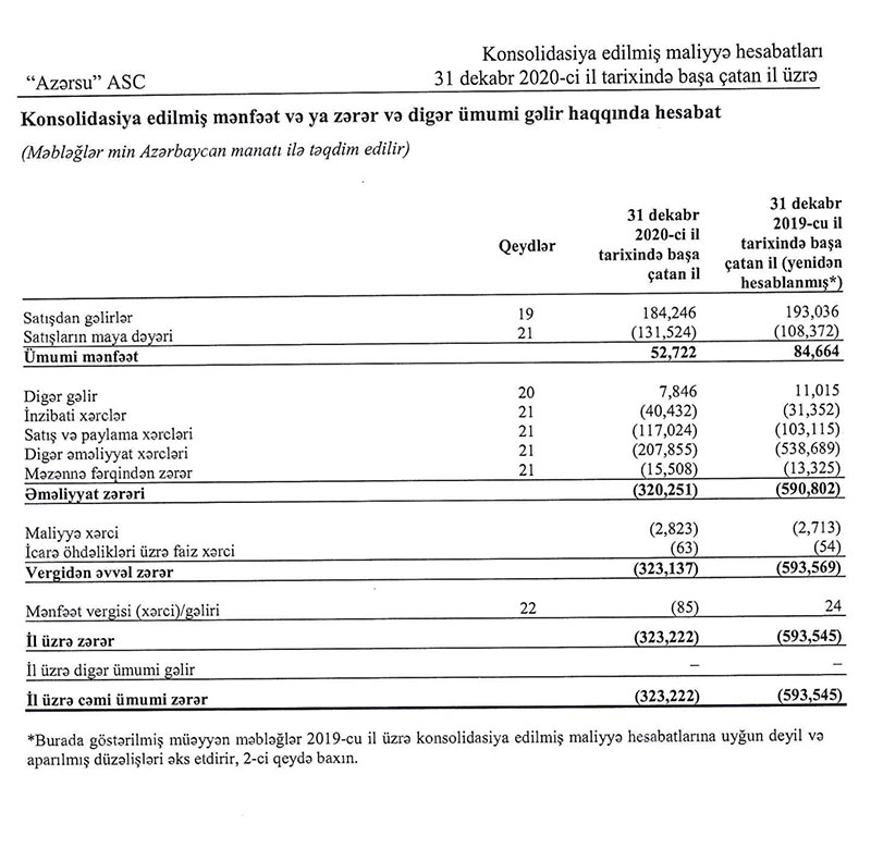 “Azərsu” ASC 2020-ci ili 323 milyon 222 min manat xalis zərər ilə başa vurub. Bu, 2019-cu illə müqayisədə 270 milyon 323 min manat və ya 45,5% azdır. ASC 2019-cu ili 593 milyon 545 min manat xalis zərər ilə bağlamışdı. 2020-ci ilin sonunda 1 milyard manat cəmi aktivləri olan “Azərsu” ASC-nin yığılmış zərəri 7 milyard 303 milyon 456 min manata çatıb.