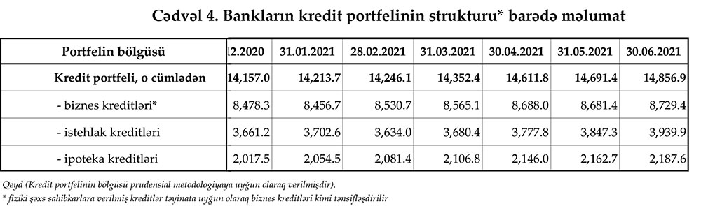 Qeyd edək ki, 2021-ci ilin Aprel ayı ilə müqayisədə May ayında istehlak kreditləri 69,5 milyon manat, ipoteka kreditləri 16,7 milyon manat artmış, biznes kreditləri isə 6,6 milyon manat azalmışdı. May ayında bank sektorunun cəmi kredit portfeli 79,6 milyon manat artmışdı.