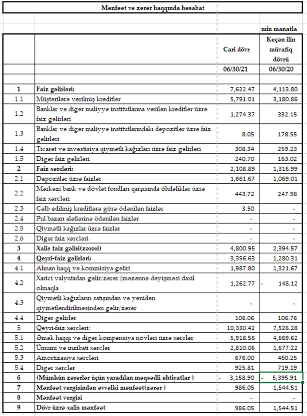 “Marja” Bankın rüblük hesabatlarına istinadən xəbər verir ki, 2021-ci ilin yanvar-iyun dövründə “Bank VTB Azərbaycan”ın cəmi gəlirləri 10 milyon 979 min manat, cəmi xərcləri 13 milyon 151 min manat, xərclər gəlirləri üstələdiyindən əməliyyat zərəri 2 milyon 172 min manat təşkil edib. Eyni zamanda, mümkün zərərlər üçün yaradılan məqsədli ehtiyatlardan azad olmuş 3 milyon 159 min manat hesabına həm əməliyyat zərəri bağlanıb, həm də Bankın 986 min manat xalis mənfəəti yaranıb.