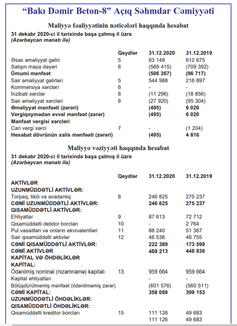 "Bakı Dəmir Beton - 8" ASC 2020-ci ili 495 manat xalis zərər ilə başa vurub. Halbuki, şirkət 2019-cu ili 4816 manat xalis mənfəət ilə bağlamışdı.