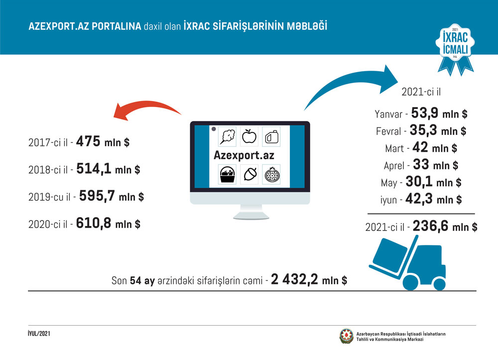 Marja İcmala istinadən xəbər verir ki, ilin ilk 6 ayı ərzində Azərbaycanın ixracının dəyəri 8.8 milyard ABŞ dolları, qeyri-neft sektoru üzrə 1,2 milyard dollar təşkil edib. Qeyri-neft sektoru üzrə ixrac 2020-ci ilin müvafiq dövrü ilə müqayisədə 248 milyon dollar və ya 27.1 faiz artıb.