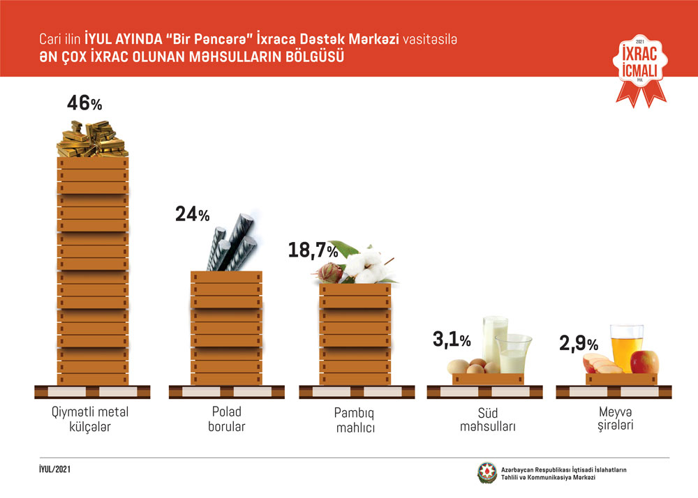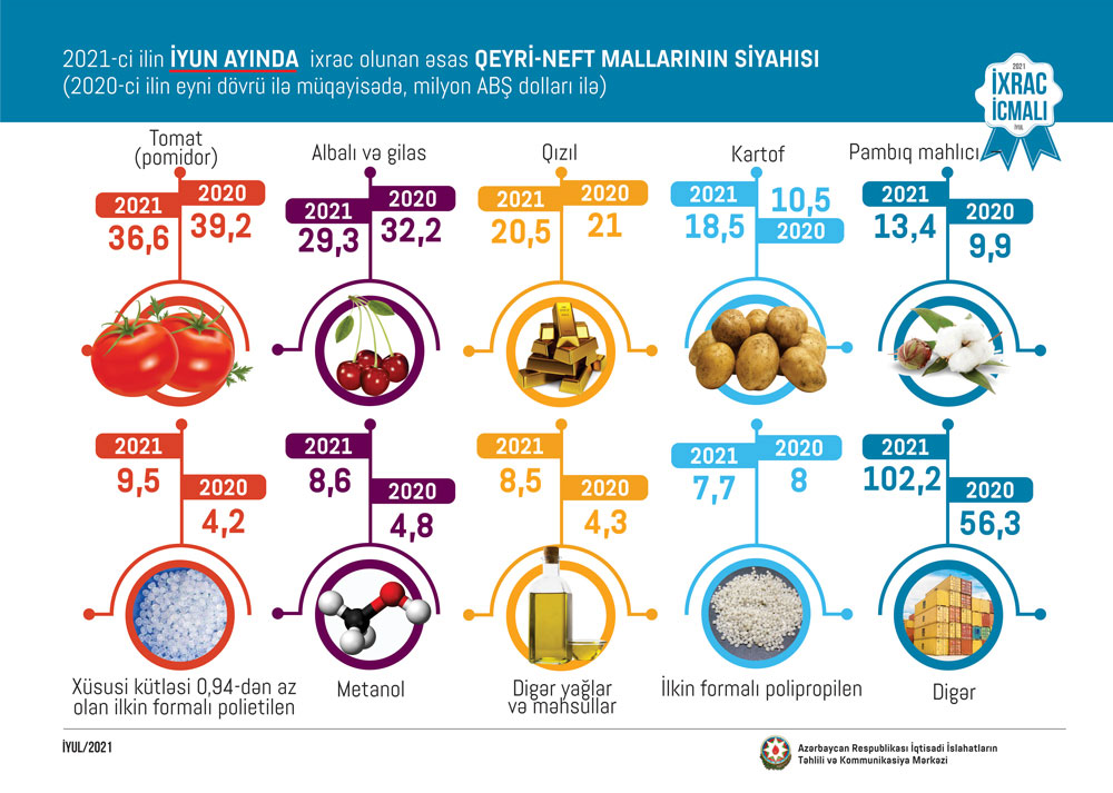 2021-ci ilin iyun ayında ixrac edilən qeyri-neft sektoruna aid malların siyahısında tomat (pomidor) (36.6 milyon ABŞ dolları) birinci, albalı və gilas (29.3 milyon ABŞ dolları) ikinci və qızıl (20.5 milyon ABŞ dolları) üçüncü olub.