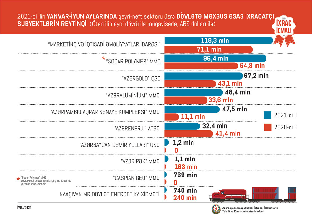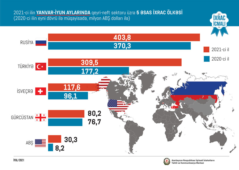 2021-ci ilin yanvar-iyun ayları ərzində Rusiyaya 403,8 milyon, Türkiyəyə 309,5 milyon, İsveçrəyə 117,6 milyon, Gürcüstana 80,2 milyon və ABŞ-a 30,3 milyon ABŞ dolları dəyərində qeyri-neft sektoruna aid mal ixrac olunub.