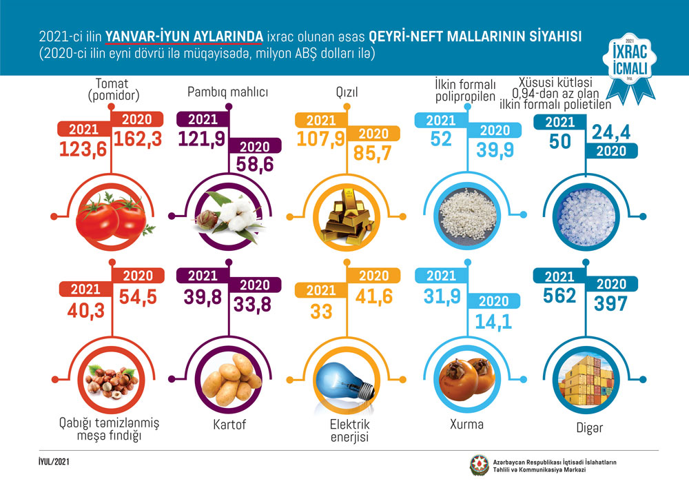 2021-ci ilin yanvar-iyun ayları ərzində ixrac edilən qeyri-neft sektoruna aid malların siyahısında tomat (pomidor) (123.6 milyon ABŞ dolları) birinci olub. Bu siyahıda pambıq mahlıcı ikinci (121.9 milyon ABŞ dolları), qızıl isə üçüncü (107.9 milyon ABŞ dolları) yerdə qərarlaşıb.