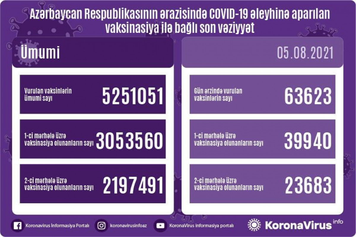 Azərbaycanda son sutkada koronavirus (COVID-19) əleyhinə 63 623 vaksin vurulub.