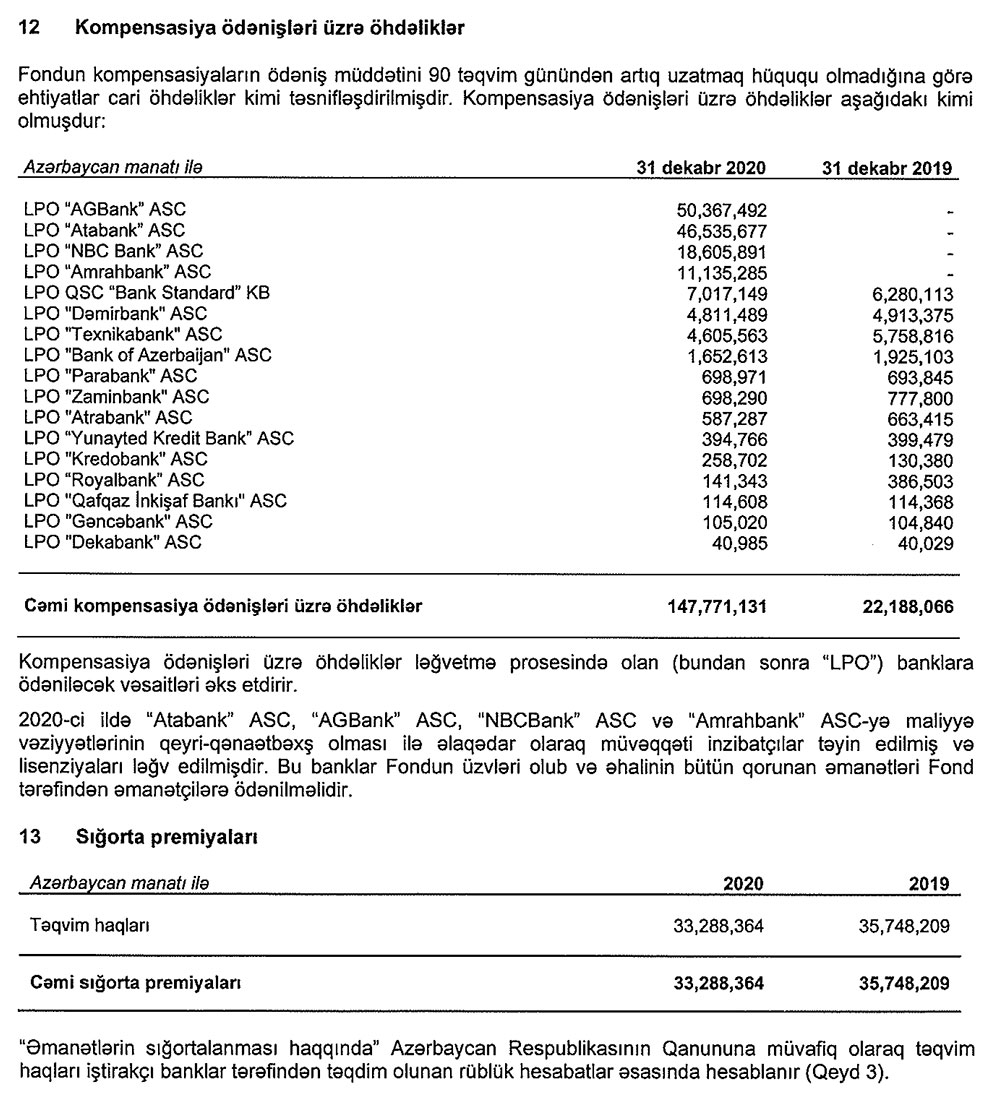 2020-ci ilin sonuna olan məlumata görə, Əmanətlərin Sığortalanması Fondu ləğvetmə prosesində olan banklara 148 milyon manata yaxın vəsait ödəməlidir.
