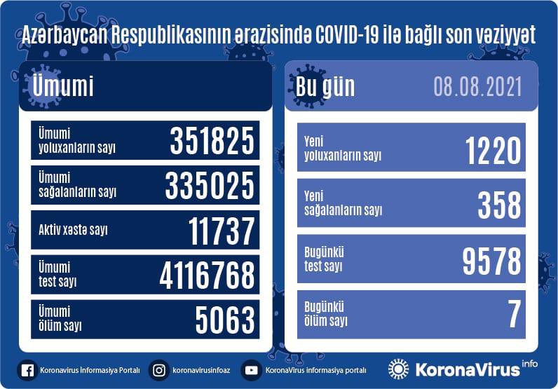 Azərbaycanda bu gün koronavirus infeksiyasına 1220 yeni yoluxma faktı qeydə alınıb, 358 nəfər müalicə olunaraq sağalıb və evə buraxılıb.