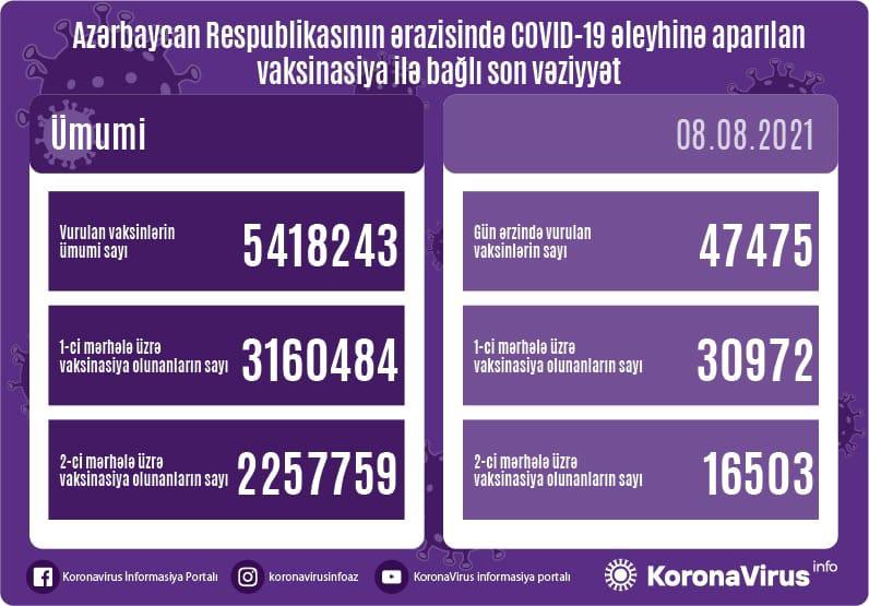 Azərbaycanda son sutkada koronavirus (COVID-19) əleyhinə 47 475 vaksin vurulub.