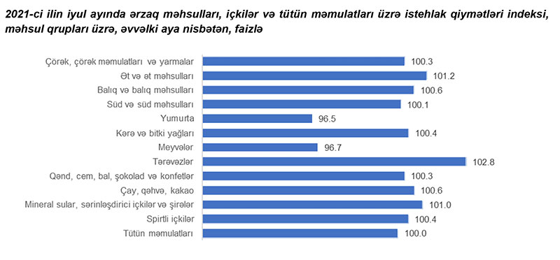 Cari ilin iyul ayında əvvəlki aya nisbətən ayrı-ayrı ərzaq məhsullarından daha çox bahalaşma qarabaşaq yarmasının, peçenyenin, makaron məmulatlarının, mal, qoyun və toyuq ətinin, kolbasa məmulatlarının, təzə və dondurulmuş balığın, qatılaşdırılmış şəkərli südün, xamanın, kəsmiyin, günəbaxan və qarğıdalı yağlarının, albalının, gilasın, kələmin, xiyarın, pomidorun, çuğundurun, yerkökünün, şəkər və şəkər tozunun, çayın, kola içkisinin, arağın, pivənin, ucuzlaşma isə əsasən yumurtanın, bananın, almanın, armudun, şaftalının, qarpızın, yemişin, üzümün, bibərin, badımcanın, kartofun, soğanın və sarımsağın qiymətlərində müşahidə olunmuşdur. Digər ərzaq məhsullarının qiymətlərində ciddi dəyişikliklər baş verməmişdir.