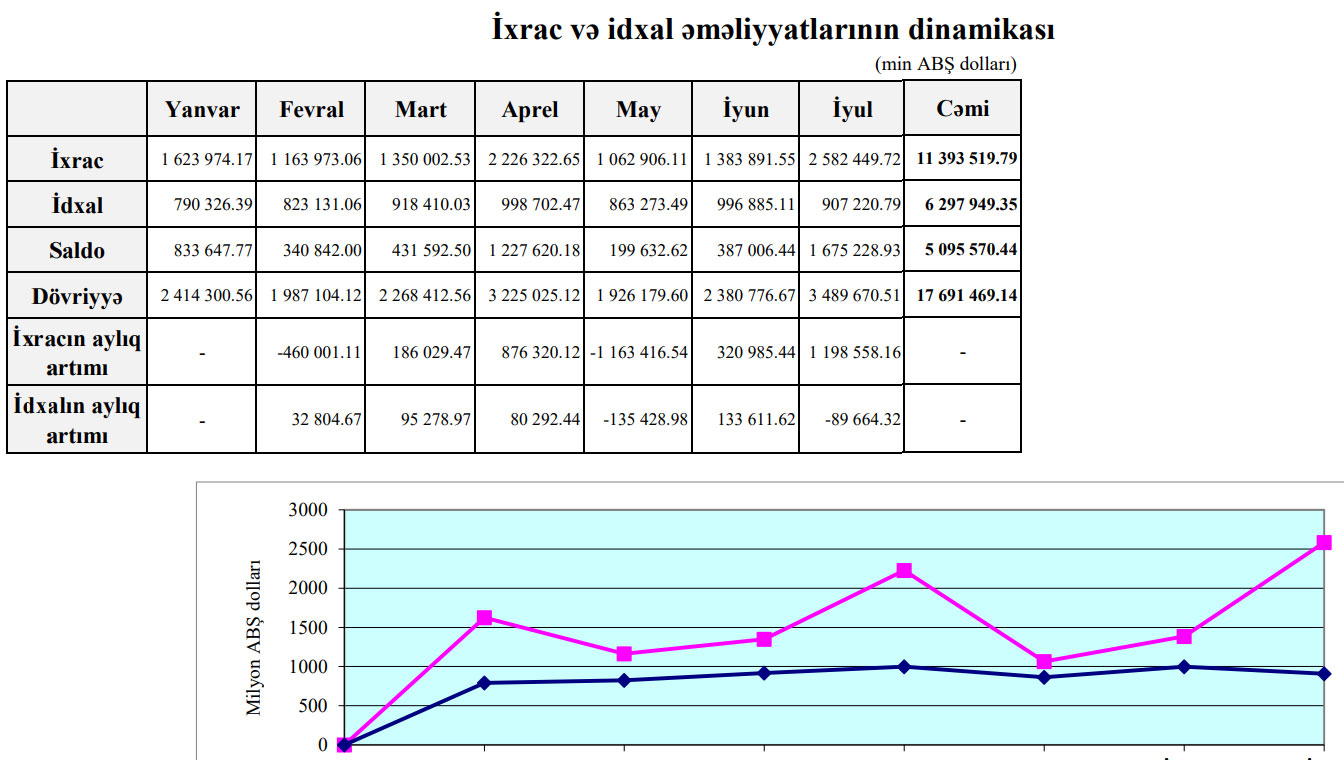Qeyd edək ki, 2020-ci ilin 7 ayı ərzində Azərbaycanın xarici ticarət əməliyyatlarının həcmi 15 milyard 31 milyon 904 min ABŞ dolları, o cümlədən idxal 5 milyard 900 milyon 766 ABŞ dolları, ixrac 9 milyard 131 milyon 138 min ABŞ dolları, saldo 3 milyard 230 milyon 371 min ABŞ dolları təşkil etmişdi.