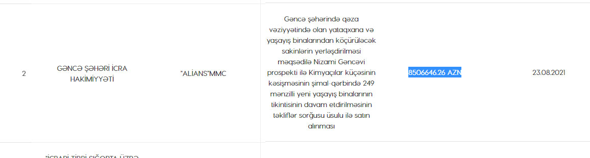 Gəncə Şəhəri İcra Hakimiyyəti şəhərdə qəza vəziyyətində olan yataqxana və yaşayış binalarından köçürüləcək sakinlərin yerləşdirilməsi məqsədilə 249 mənzilli yeni yaşayış binalarının tikintisinin davam etdirilməsi ilə bağlı elan etdiyi təkliflər sorğusuna yekun vurub.