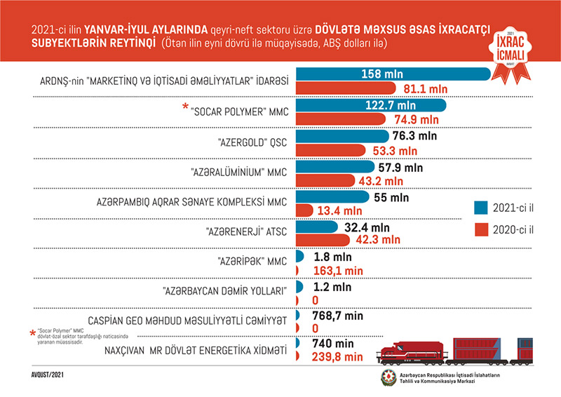 2021-ci ilin yanvar-iyul ayları üzrə hazırlanan qeyri-dövlət ixracatçı subyektlərin reytinqində ilk onluqda aşağıdakı şirkətlər təmsil olunurlar: "MKT İstehsalat Kommersiya" MMC, "Azərbaycan İnterneyşnl Mayninq Kompani Limited Şirkəti"nin Azərbaycan Respublikasındakı nümayəndəliyi, "Local Garden", "P-Aqro" MMC, "Baku Steel Company" MMC, "Sun Food" MMC, "Azərbaycan Şəkər İstehsalat Birliyi" MMC, "Ram Beynəlxalq Nəqliyyat və Ticarət LTD" MMC, “FruitLand" MMC və Cəfərov İlqar Südgül oğlu.