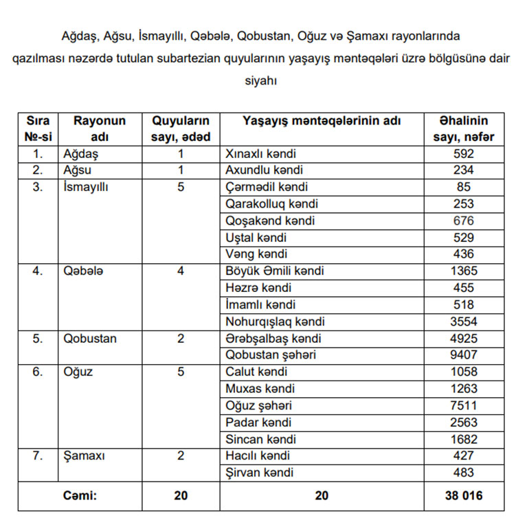 Marja xəbər verir ki, Sərəncama əsasən, Ağdaş, Ağsu, İsmayıllı, Qəbələ, Qobustan, Oğuz və Şamaxı rayonlarının əhalisi 38016 nəfər olan 20 yaşayış məntəqəsində (siyahı əlavə olunur) əkin sahələrinin və əkin üçün istifadə olunan həyətyanı torpaq sahələrinin suvarma suyu ilə təminatının yaxşılaşdırılması, habelə əhalinin içməli suya tələbatının ödənilməsi üçün 20 ədəd subartezian quyusunun layihələndirilməsi və qazılması məqsədilə 2021-ci il dövlət büdcəsində Azərbaycan Meliorasiya və Su Təsərrüfatı Açıq Səhmdar Cəmiyyətinə 1,4 milyon manat ayrılıb.