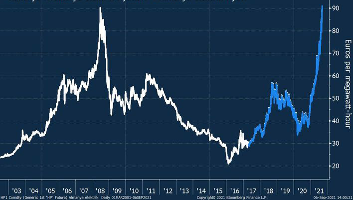 Avropa elektrik enerjisi qiymətləri, təbii qaz və karbon emissiyası üzrə icazə qiymətlərindəki artım ilə əlaqədar olaraq 2008-ci ildəki səviyyələri aşaraq yeni rekord qırıb.Avropa elektrik qiymətləri göstəricisi olan Almaniya-Avstriya elektrik qiymətləri, təbii qaz və karbon emissiyası icazələrindəki qiymət artımından sonra maliyyə böhran zamanında çatdığı səviyyəni də aşaraq yeni bir rekord qırıb (xəbərin sonundakı cədvəldən ətraflı tanış ola bilərsiniz). "Citigroup" Avropada elektrik enerjisi qiymətlərinin 20% ətrafında yüksələ biləcəyini nəzərdə tutur.