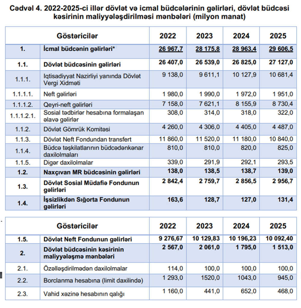 2022-ci ildə icmal büdcənin gəlirləri 26 milyard 967,7 milyon manat, xərcləri 32 milyard 145,9 milyon manat, kəsiri isə 5 milyard 178,2 milyon manat səviyyəsində proqnozlaşdırılır.