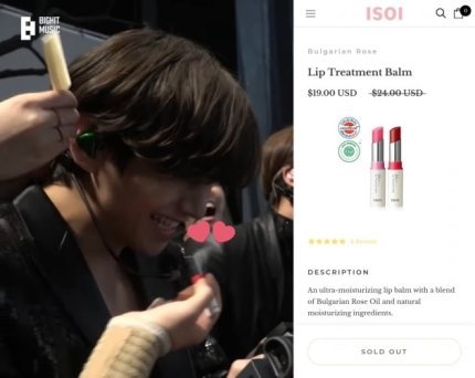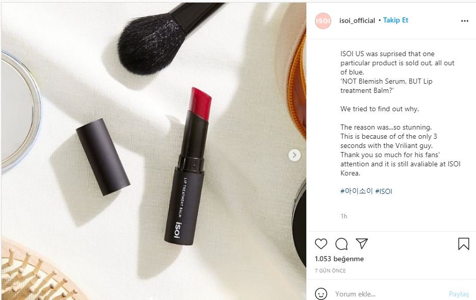 Dodaq pomadası markası, məşhur Koreya pop qrupu BTS sayəsində satışlarını qatladıPop qrupu BTS-in üzvü, Cənubi Koreyanın pop musiqiçisi Taehyung-un, ISOI adlı bir Koreya kosmetika markasının məhsulunu dodağına sürtdüyü videonun sosial mediada yayılmasının ardından şirkətin anbarlarında həmin məhsul qısa müddət ərizndə tükənib.