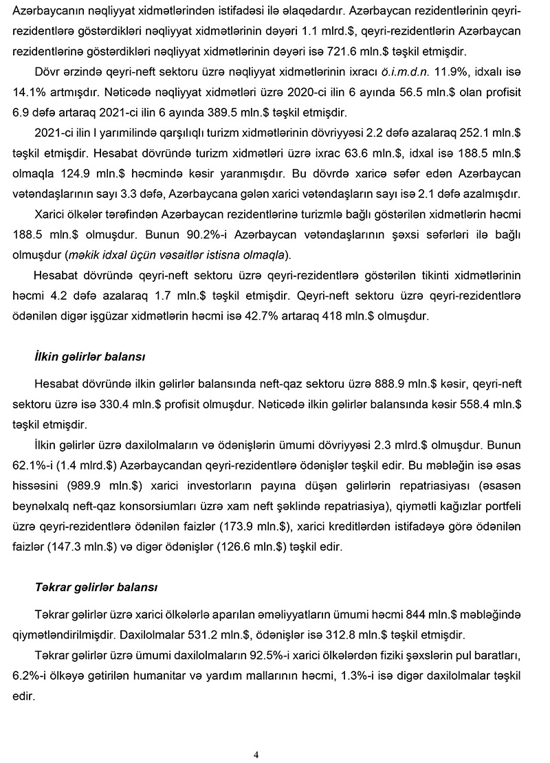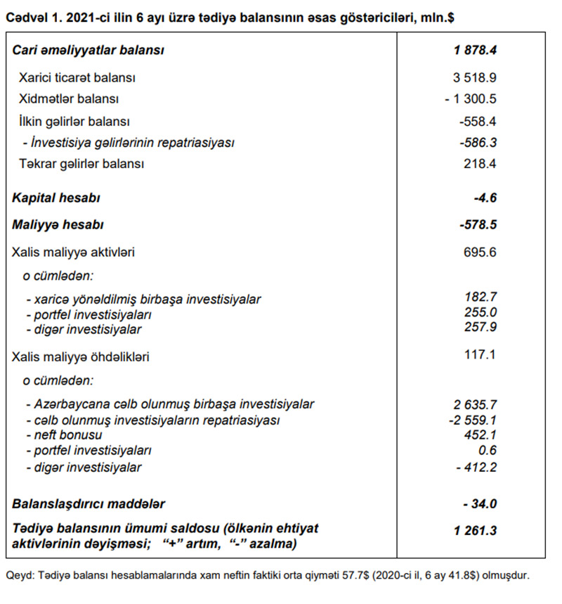 2021-ci ilin 1-ci yarımilliyində Azərbaycanın tədiyyə balansında 1,3 milyard dollar artıqlıq (profisit) yaranıb. Halbuki, 2020-ci ilin eyni dövründə 956,4 milyon dollar kəsir yaranmışdı.